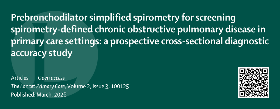 《柳叶刀-初级保健》(The Lancet Primary Care)发表一项前瞻性横断面诊断准确性研究,旨在评估支气管舒张剂前简易肺功能检查,在基层医疗机构中筛查肺功能定义慢阻肺病的临床效能。研究发现,在经支气管舒张剂后常规肺功能确诊的慢阻肺病患者中,若采用支气管舒张剂前的简易肺功能检查进行筛查,93.0%的患者结果为阳性,7.0%为阴性。该方法识别慢阻肺病的判别准确度高,其中阳性预测值为60.0%,阴性预测值为99.6%。识别图中二维码或点击文末阅读原文,查阅原文。