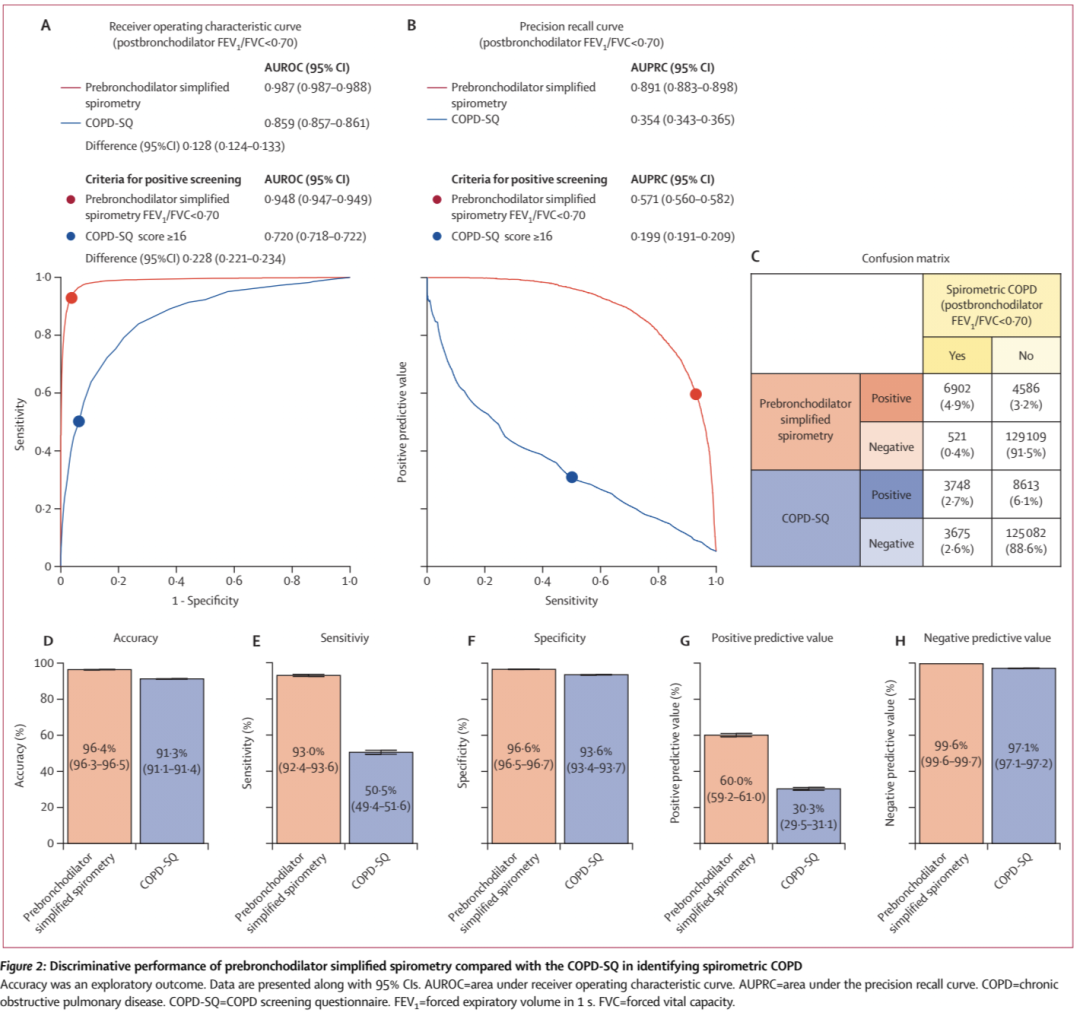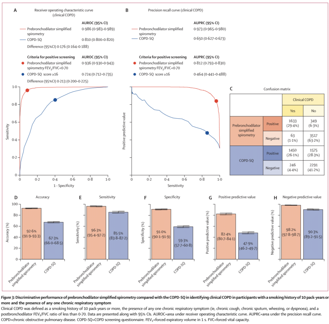 慢性阻塞性肺疾病(慢阻肺病)的早期发现与识别需要简便且高准确度的方法。小样本概念验证研究显示,简易肺功能检查识别肺功能定义的慢阻肺病具有较高准确性,但其临床应用价值仍需在大规模真实世界社区人群中验证。本研究旨在评估支气管舒张剂前简易肺功能检查,在基层医疗机构中筛查肺功能定义慢阻肺病的临床效能。本项多中心、观察性、横断面诊断准确性研究为呼吸健康队列研究的附属研究;该队列研究为一项基于社区人群的观察性队列研究,于2023年7月14日至2025年4月30日在中国招募年龄≥20岁的社区成年居民,研究在我国3个省份的15家基层医疗机构开展。纳入标准为年龄≥20岁、本地常住居民、签署书面知情同意书,并愿意完成本研究相关各项检查与评估。主要排除标准为,入组前1个月内发生呼吸道感染或慢阻肺病急性加重、既往3个月内发生心肌梗死、既往1个月内因心脏病住院。受试者依次完成慢阻肺病筛查问卷、接受支气管舒张剂前简易肺功能检查,及支气管舒张剂后常规肺功能检查。常规肺功能检查按照国际技术标准完成3次符合可接受性与重复性的呼气曲线;简易肺功能仅需完成首次符合可接受性的呼气曲线。肺功能定义慢阻肺病判定标准为支气管舒张剂后1秒用力呼气容积与用力肺活量比值<0.70。主要结局指标为支气管舒张剂前简易肺功能检查识别肺功能定义慢阻肺病的判别准确度,以受试者工作特征曲线下面积(AUROC)评估;其他结局指标包括精确率-召回率曲线下面积(AUPRC)、灵敏度、特异度、阴性预测值(NPV)及阳性预测值(PPV)。共159,050名受试者完成慢阻肺病筛查问卷,其中141,118人具备完整的简易肺功能与常规肺功能数据并纳入最终分析。受试者平均年龄47.1岁(标准差SD 13.3),男性64,196名(45.5%),女性76,922名(54.5%),在141,118人中,7423人(5.3%)符合肺功能定义慢阻肺病诊断标准。在经支气管舒张剂后常规肺功能确诊的7423例慢阻肺病患者中,6902例(93.0%)支气管舒张剂前简易肺功能检查结果为阳性,521例(7.0%)为阴性。支气管舒张剂前简易肺功能识别肺功能定义慢阻肺病的判别准确度高,AUROC为0.987(95% CI 0.987~0.988),AUPRC为0.891(95% CI 0.883~0.898),灵敏度为93.0%(95% CI 92.4~93.6),特异度为96.6%(95% CI 96.5~96.7),阳性预测值为60.0%(95% CI 59.2~61.0),阴性预测值为99.6%(95% CI 99.6~99.7)。图2 在识别基于肺功能定义的慢阻肺病时,支气管舒张剂前简易肺功能检查相较于慢阻肺病筛查问卷的判别性能图3 在吸烟史≥10包年且至少存在一种慢性呼吸道症状的受试者中,识别临床诊断的慢阻肺病时,支气管舒张剂前简易肺功能检查相较于慢阻肺病筛查问卷的判别性能鉴于其极高的阴性预测值,支气管舒张剂前简易肺功能检查可在基层医疗机构中更广泛应用,以减少肺通气功能正常者进行不必要的进一步检查。该方法在社区大规模推广应用的可行性仍需进一步评估。END团队介绍