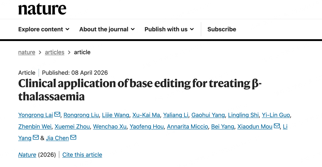 当地时间4月8日,顶刊《自然》发布“β-地中海贫血”碱基编辑疗法CS-101注射液临床试验结果,5名原本需要定期终身输血的患者,经治疗后彻底达到临床治愈,回归正常生活。