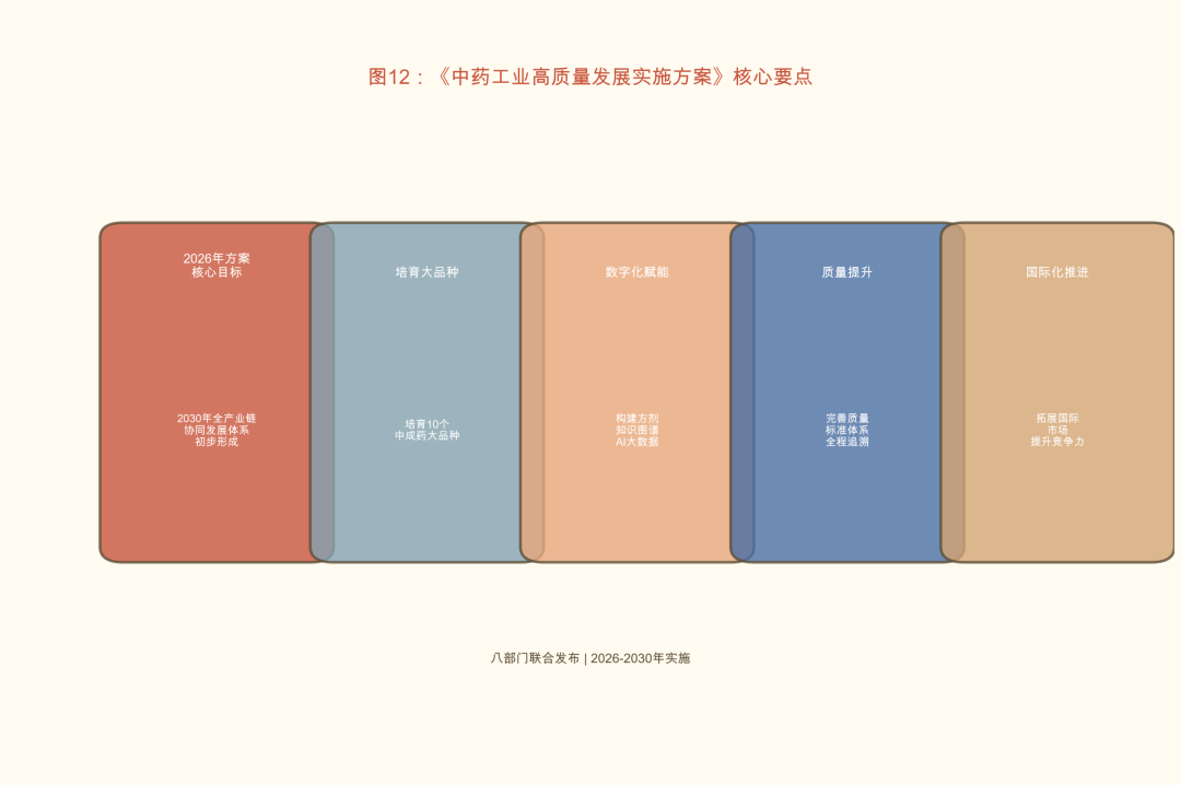 2026年2月,工业和信息化部等八部门联合发布《中药工业高质量发展实施方案(2026-2030年)》,这是当前中药提取物产业最重要的政策文件。方案明确了以下核心目标: