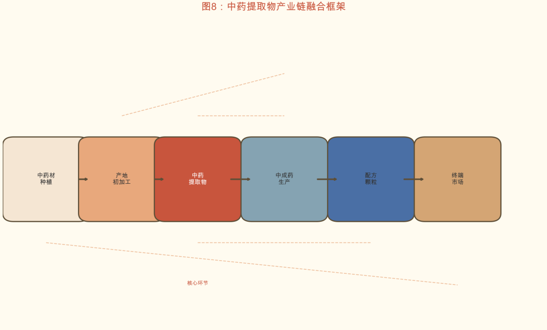 中药提取物在产业链中处于承上启下的核心位置,连接上游中药材种植与下游终端产品应用。产业融合发展趋势日益明显。