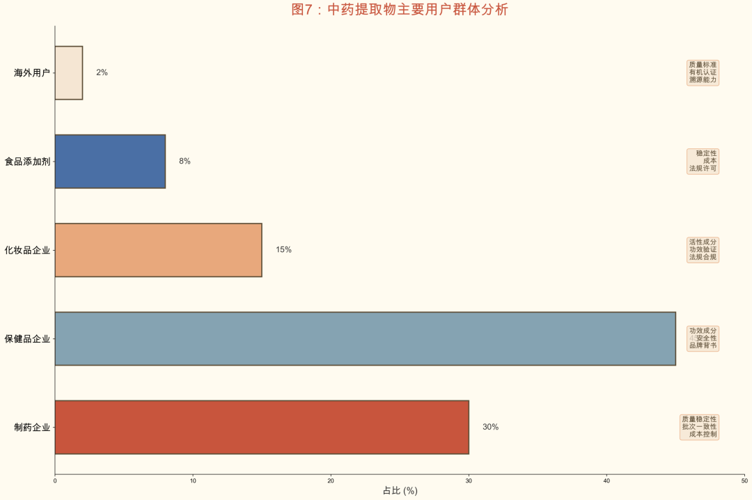 中药提取物的下游用户群体涵盖制药企业、保健食品企业、化妆品企业、食品添加剂企业以及海外用户,各群体需求特征存在差异。