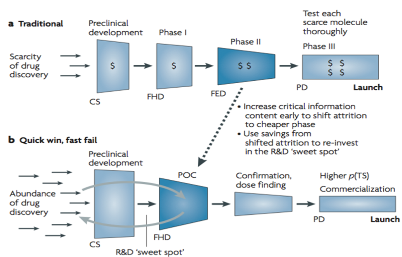 2026年了,我们站在一个科技与认知空前繁荣的时代节点上。基因编辑、细胞疗法、人工智能制药……生命科学的边界以前所未有的速度向外延伸,为攻克顽疾带来了前所未有的曙光。然而,与这激动人心的科学图景形成鲜明对比的,是整个创新药研发行业挥之不去的效率阴霾。一种被称为“反摩尔定律”的现象,如同一个冷酷的咒语,依然笼罩着我们:每十亿美元研发投入所能获得的新药批准数量,大约每九年就会减半。图1药物研发成功率(来源: Clinical Development Success Rates, BIO 2015 THE MIND-BLOWING)我们无法回避一个残酷的现实:一款新药从实验室到患者手中,平均耗时超过十年,耗资动辄超过20亿美元。更令人揪心的是,进入临床试验的候选药物,最终能成功上市的几率不足十分之一,甚至在5%左右徘徊。这意味着,行业中绝大部分——约75%的研发投入——最终都流向了失败的项目。那些代价高昂的后期临床失败案例,不仅造成巨大的财务损失,更占用了宝贵的资源,延缓了无数潜在好药的前进步伐。面对研发成本螺旋式上升、科学复杂性指数级增长、支付方压力日益严峻的三重夹击,传统的、线性的、以“不惜一切代价避免失败”为核心的研发模式,已显得力不从心。我们不禁要问,是否有一条新的路径,能够帮助我们走出这个“高投入、高风险、长周期”的泥潭?在这样的背景下,一个看似反直觉,实则蕴含深刻智慧的战略逐渐走向舞台中央,那就是——“快速失败”。这并非鼓励失败,而是一种主动的、系统性的策略,旨在研发早期、成本最低的阶段,通过“聪明的失败”来为“最终的胜利”铺平道路。图2 “速赢,速败”药物开发范式与传统方法之比较(参考3)“速败”的逻辑:为何放弃比坚持更需要智慧