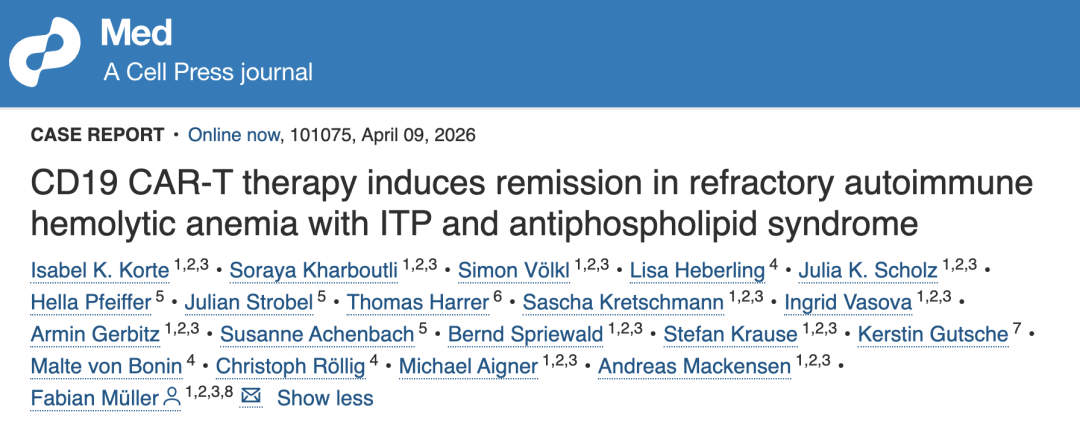 这一特殊案例表明,CD19 CAR-T 细胞疗法能够使严重难治自身免疫性溶血性贫血(AIHA)迅速且持久地缓解,同时改善伴发的免疫性血小板减少症(ITP)和抗磷脂抗体综合征(APLAS),且毒性反应良好。