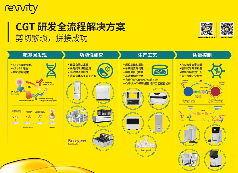 瑞孚迪(Revvity)乘政策东风,以硬核技术致力于为药企与科研机构破解研发痛点,全新推出 CGT 研发全流程解决方案,从靶基因发现、功能验证到生产与质量控制,整合 CRISPR 筛选、分子检测、细胞分析、病毒定量及活体成像等关键技术,帮助科研团队 简化流程、提升效率,加速 CGT 项目推进。
