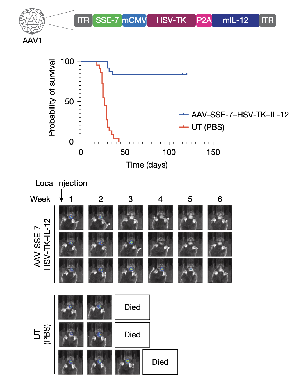 接下来,研究团队将这些发现转化为了基因疗法,他们使用腺相关病毒(AAV)载体递送,由 SSE-7 驱动双重载荷:细胞毒性基因单纯疱疹病毒胸苷激酶(HSV-TK)和免疫调控因子 IL-12。HSV-TK 将更昔洛韦(GCV)转化为具有细胞毒性的核苷类似物,从而杀死 GSC,而 IL-12 能改善肿瘤免疫微环境并诱导免疫记忆。