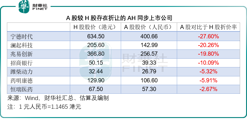 根据撰稿时的AH股价格,我们留意到,当前出现H股溢价、A股折让的公司主要包括宁德时代(03750.HK)(-27.60%)、澜起科技(06809.HK)(-20.26%)、兆易创新(03986.HK)(-19.80%)、招商银行(03968.HK)(-10.09%)、潍柴动力(02338.HK)(-5.32%)、药明康德(02359.HK)(-5.91%)、恒瑞医药(01276.HK)(-2.67%),见下表。