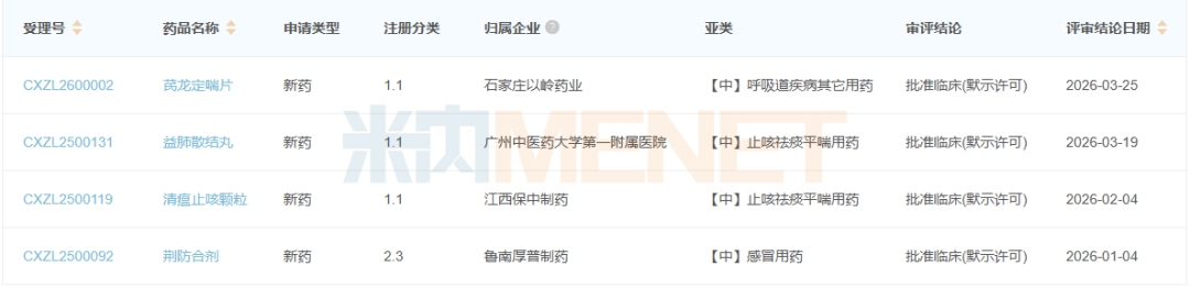 此外,4款产品获批临床,以岭药业的芪龙定喘片、广州中医药大学第一附属医院的益肺散结丸、江西保中制药的清瘟止咳颗粒均为中药1.1类新药。