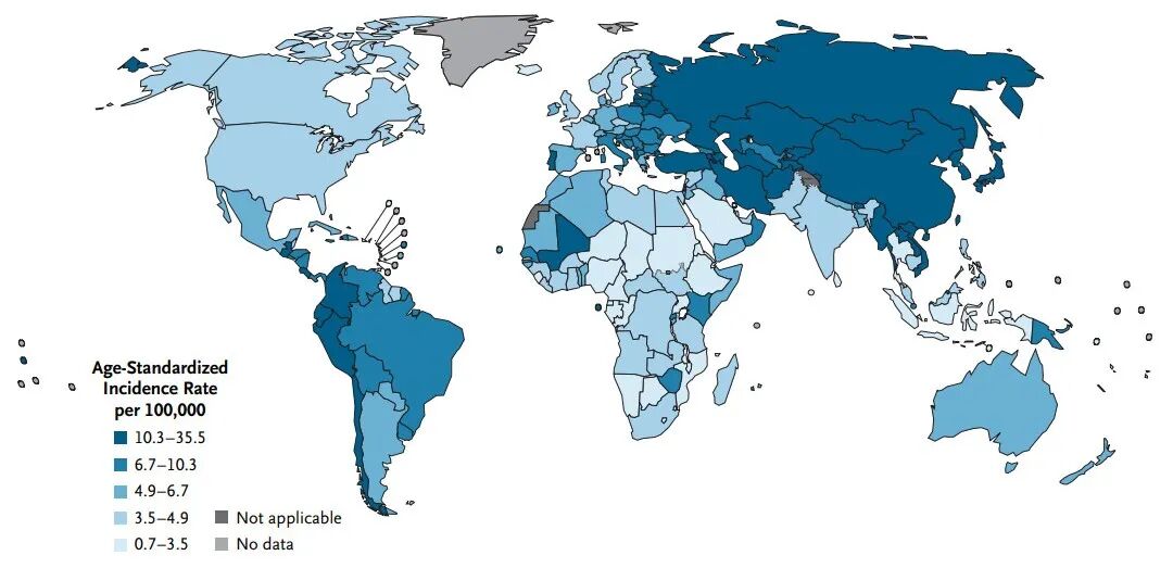 2022年全球胃癌年龄标化发病率(男性和女性,按国家)