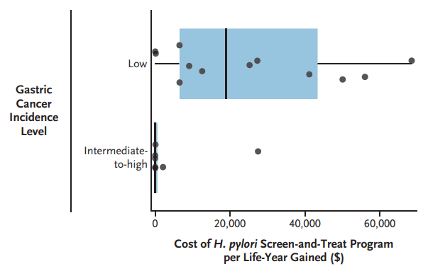 在高危人群中,Hp筛查-治疗项目具有成本效果(甚至可节省成本),在低危人群中也很可能成本效果。成本效果随胃癌及其他Hp相关疾病风险升高而改善。决策建模应基于试点项目收集的本地数据,并纳入长期随访的辅助获益(如消化性溃疡、消化不良减少)和潜在危害(如耐药)来优化平衡。