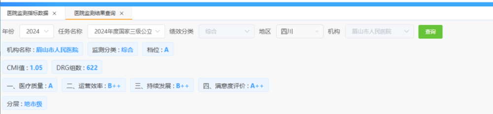 庄一强对“医学界”表示:“让大学生与大学生比、中学生与中学生比、小学生与小学生比,更有利于提升各层级医院的工作积极性,也更有利于分级诊疗的推进。”“医学界”还观察到,一批县市级医院借助共建、医联体、托管等帮扶机制,实现了等级突破。暨南大学附属第六医院(东莞市东部中心医院) 在此次监测中获得了B++的成绩。该院原是东莞市常平医院,是一所镇街医院,2020年底正式更名为“暨南大学附属第六医院”,为暨南大学直属附属医院。自此,医院国考等级一路跃升,2021年度C++→2022年度B→2023年度B+→2024年度B++。一年一个台阶的背后,是校地共建与高水平医院的支持。据医院介绍,暨南大学先后选派了多名“双肩挑”管理及学科带头人扎根东莞,人才梯队较共建前实现了跨越式增长。同时,新技术新项目不断迭代升级,骨科、神经外科、眼科、泌尿外科等领域“首例”技术层出不穷,多项技术填补东莞乃至广东省空白,微创手术、四级手术占比持续提升。校地共建以来,医院还实现了国家自然科学基金零的突破。中山大学附属第六医院粤西医院的帮扶模式则是医联体。2023年2月,信宜市人民政府、中山大学附属第六医院、信宜市人民医院正式签约,信宜市人民医院加挂“中山大学附属第六医院粤西医院”牌子,建立紧密型医联体关系。据中山大学附属第六医院介绍,截至目前,已累计派驻34名常驻专家及超700人次柔性帮扶专家至信宜。2023年,信宜市人民医院完成四级高难度手术量增长70%,2024年前三季度同期增幅达56%,并在广东省县域三级医院DRGs能力指数排名中,跃升至第二位。2022年度国考结果显示,中山大学附属第六医院粤西医院/信宜市人民医院排名从926位跃升为446名,国家监测指标等级从B提升至B++;2024年度,首次挺进“A”。眉山市人民医院也是 “大手牵小手” 协同发展的典型样本。2020年1月10日,在四川大学华西医院和眉山市委、市政府的共同推动下,眉山市人民医院接受华西医院领办,挂上了华西的牌子,成为四川大学华西医院眉山医院。在四川大学华西医院领办帮扶下,眉山市人民医院的国考成绩从 B+、B++ 稳步晋级,2024年度进入A 级档位,正式迈入全国前 20% 序列。7年间有不少变化,从最初的排名比拼,到如今更加理性地看待等级区间、深挖分项短板;从顶级医院的“独享赛道”,到区县级医院也可以冲入A+……不变的是国考本质,推动公立医院健全公益性运行机制,提升医疗服务能力,规范运营管理,增强持续发展动力。