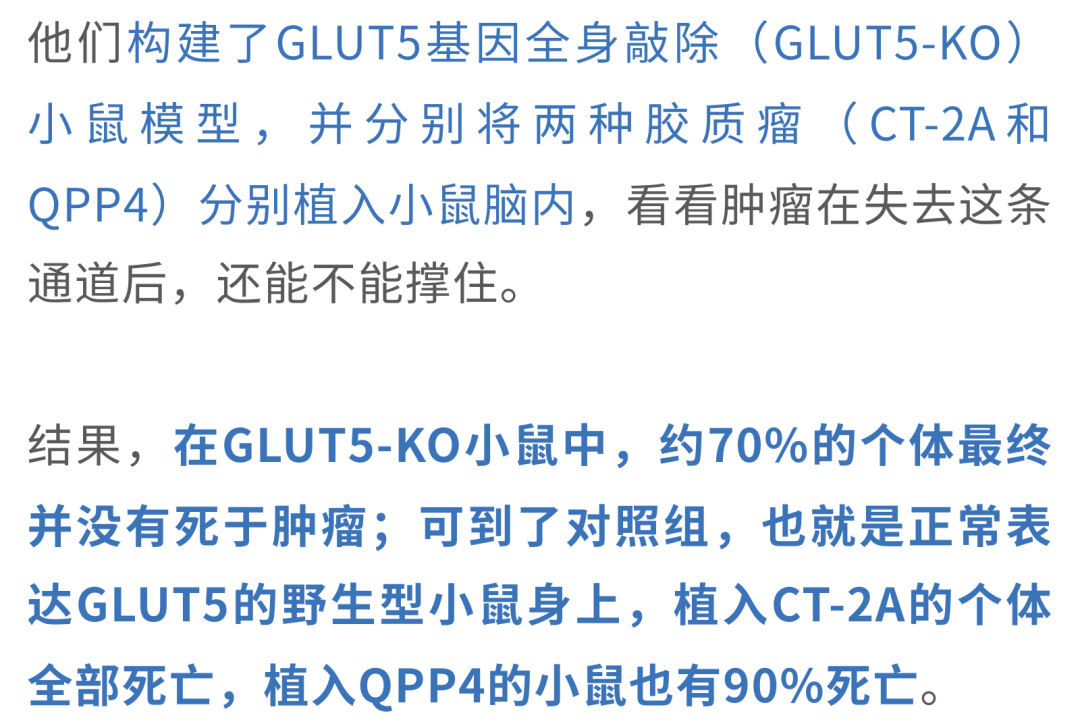 可见,一旦把GLUT5的通道关闭,胶质瘤不仅生长明显受挫,连在脑内「安营扎寨」,顺利把「地盘」占下来都变得困难重重。