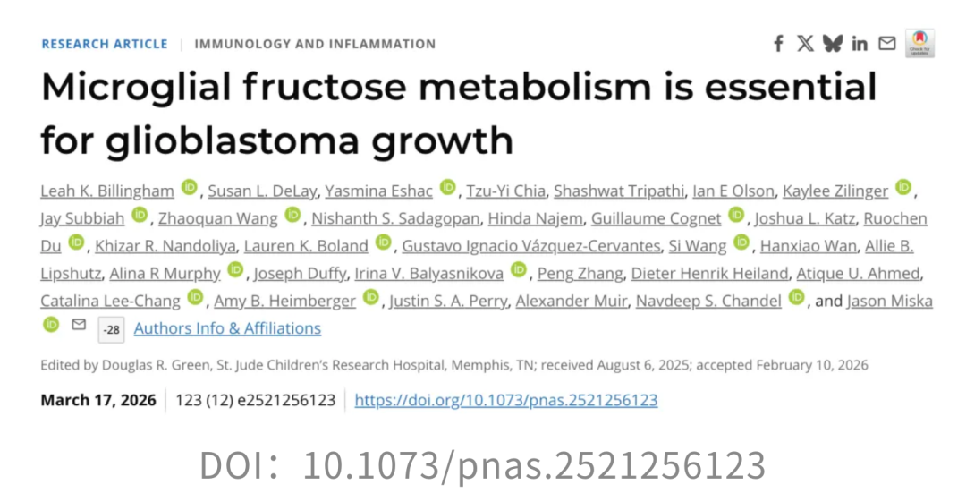 [1]Billingham LK, DeLay SL, Eshac Y, Chia TY, Tripathi S, Olson IE, Zilinger K, Subbiah J, Wang Z, Sadagopan NS, Najem H, Cognet G, Katz JL, Du R, Nandoliya KR, Boland LK, Ignacio Vázquez-Cervantes G, Wang S, Wan H, Lipshutz AB, Murphy AR, Duffy J, Balyasnikova IV, Zhang P, Heiland DH, Ahmed AU, Lee-Chang C, Heimberger AB, Perry JSA, Muir A, Chandel NS, Miska J. Microglial fructose metabolism is essential for glioblastoma growth. Proc Natl Acad Sci U S A. 2026 Mar 24;123(12):e2521256123. doi: 10.1073/pnas.2521256123. Epub 2026 Mar 17. PMID: 41843684; PMCID: PMC13012084.