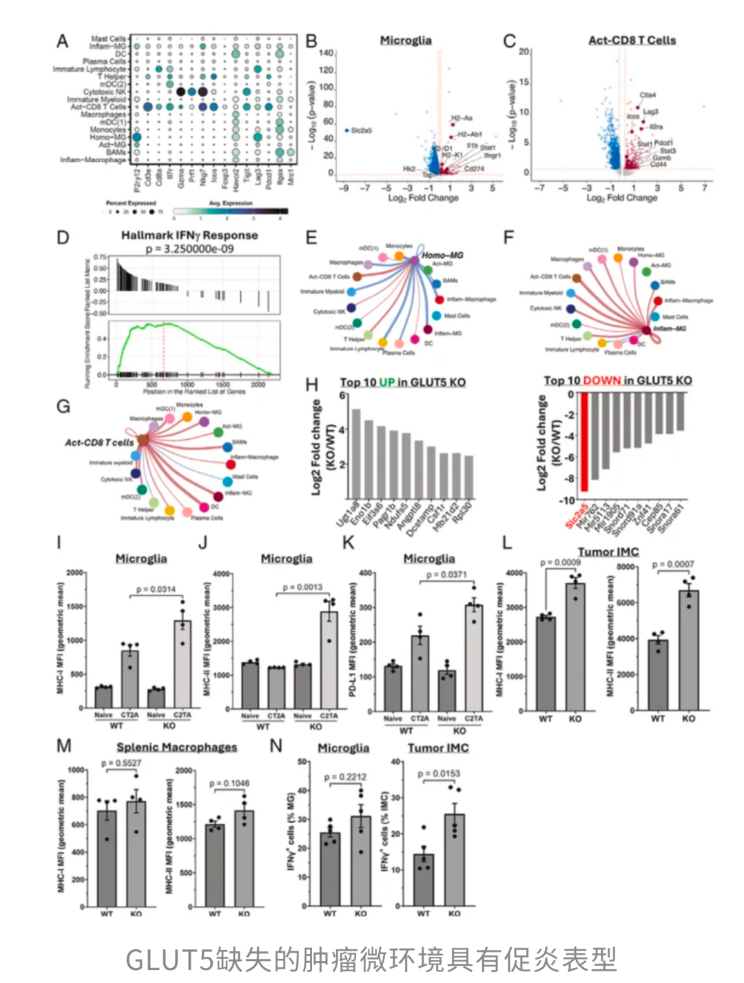 研究者又对植入CT-2A胶瘤14天后的小鼠脑内免疫细胞进行了分析。他们发现,GLUT5-KO小鼠肿瘤微环境中的免疫系统明显被「点燃」了。