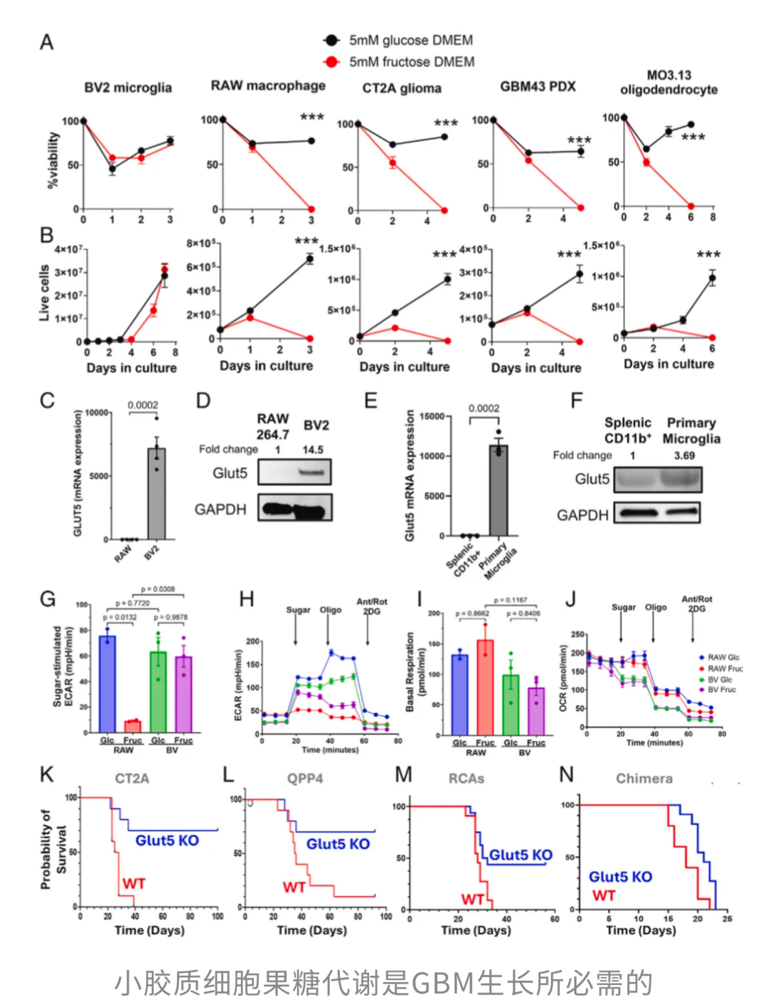 单细胞RNA测序的结果也佐证了这一发现。在GBM的免疫细胞群中,高表达果糖转运蛋白GLUT5的,几乎只剩下小胶质细胞;而那些来自外周的免疫细胞,GLUT5表达极低,甚至接近「缺席」。没有「专用通道」,果糖就算再多,也很难真正进入细胞被利用。
