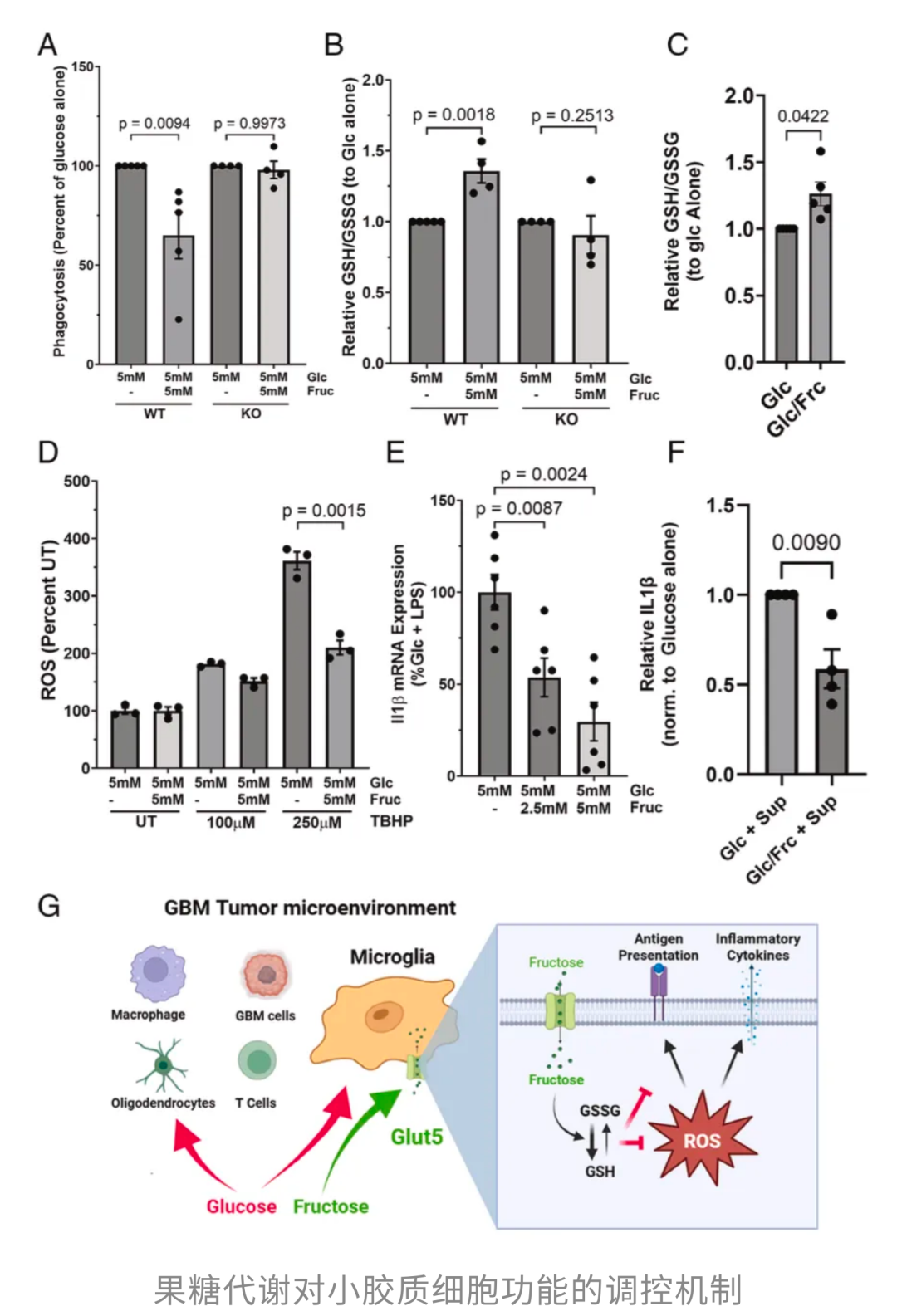 果糖通过GLUT5进入小胶质细胞后,会增强它们维持氧化还原稳态的能力,让其还原型谷胱甘肽/氧化型谷胱甘肽(GSH/GSSG)比值升高,活性氧(ROS)水平下降,相当于给这些免疫细胞装上了一套更强的「灭火系统」。「火气」被压下去之后,小胶质细胞吞噬凋亡肿瘤细胞、处理并呈递肿瘤抗原的能力都跟着减弱了。