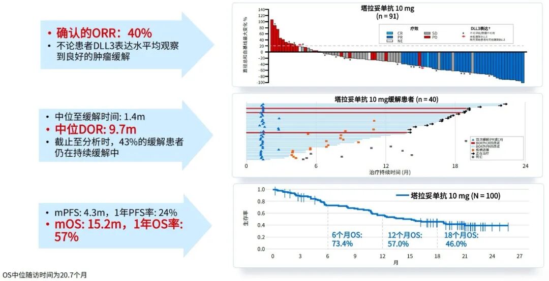 全球II期DeLLphi-301研究率先验证了塔拉妥单抗在难治人群中的突破性价值。入组患者均为既往接受过两线及以上治疗的复发难治性SCLC,4线以上患者占比34%。结果显示,接受10mg剂量治疗的患者,经独立评审确认的ORR达到40%,中位缓解持续时间(DoR)为9.7个月,中位OS更是突破性地达到15.2个月[9,13]。这意味着,在传统治疗中位生存仅以月计的末线患者中,塔拉妥单抗使超过四成患者实现肿瘤显著退缩,并获得超过一年的长期生存,这一后线生存获益,已可比肩一线治疗的数据。
