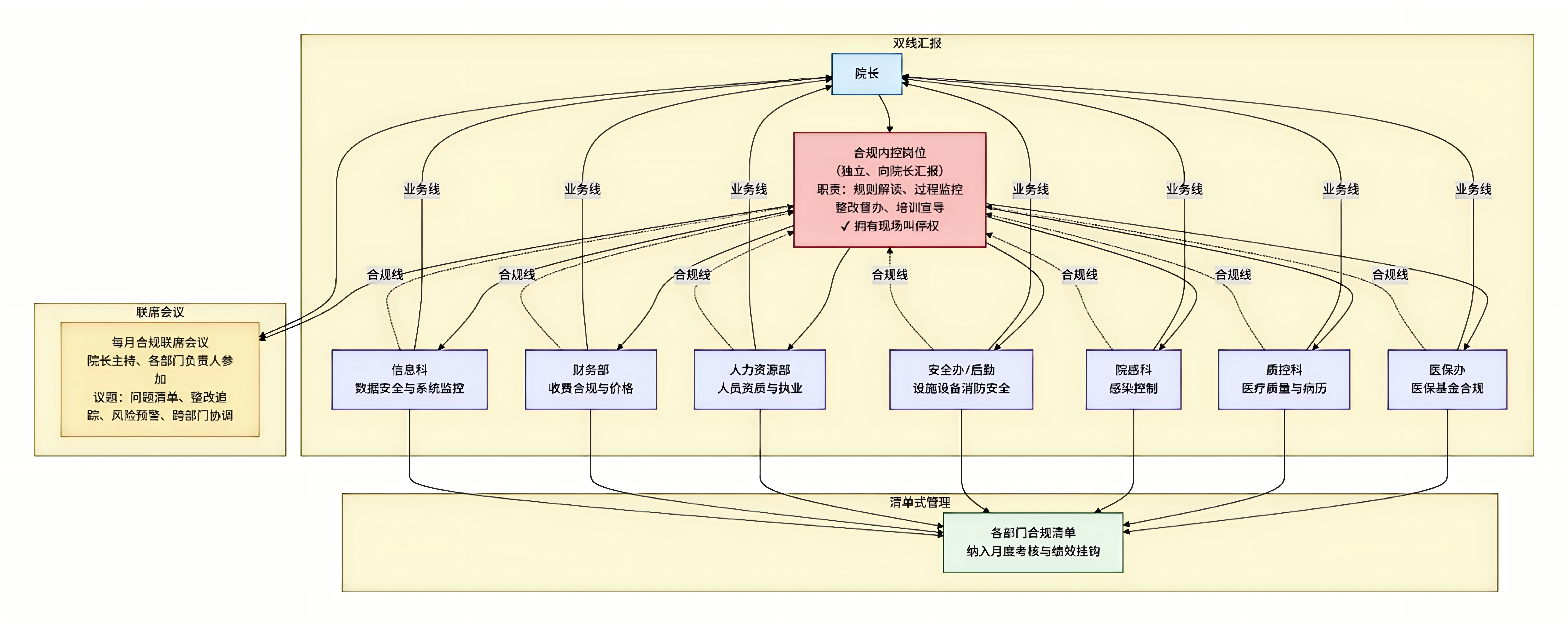 在完成认知升维与明确红线之后,还需通过强有力的组织保障,将合规要求转化为全院上下的自觉行动与刚性约束,确保“合规有人管、能管住”。合规并非某一个部门的职责,而是一张覆盖全院的管理网络。
