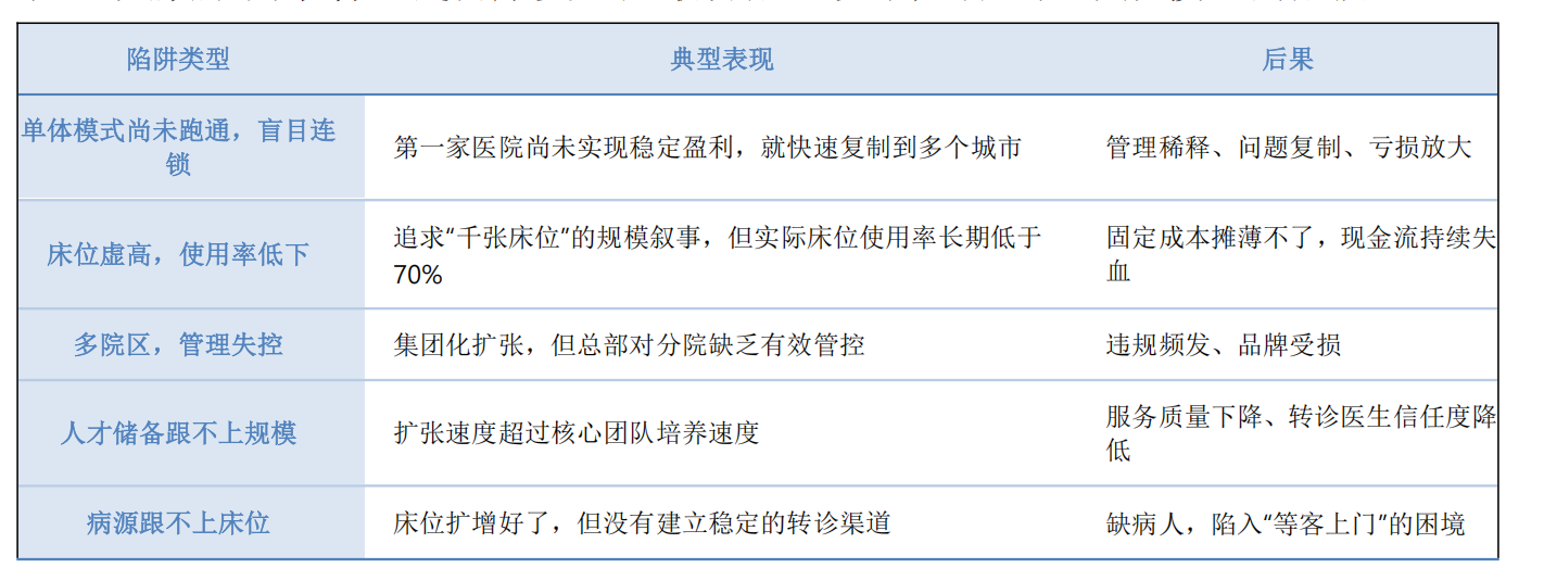 康复医院的“有效规模”可理解为:在确保单店盈利模型成熟、核心团队稳定、顾客价值可有效交付的前提下,适度且有序地拓展服务半径与床位数量。从大量失败案例来看,民营康复医院最易陷入以下几种“无效规模”的陷阱: