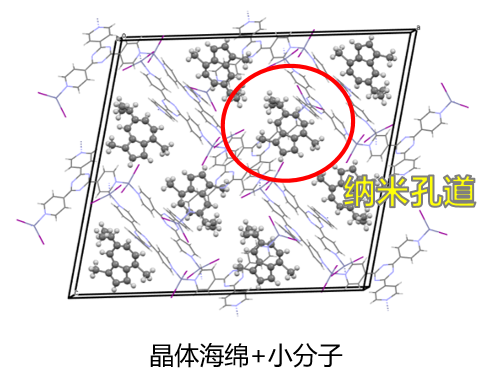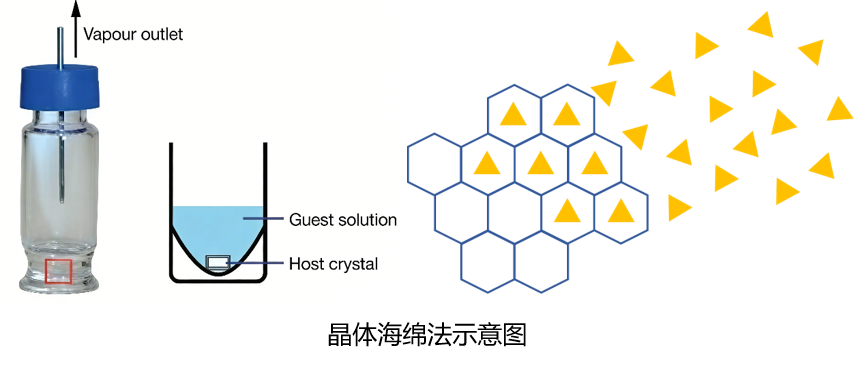 晶体海绵法是将提前结晶好的、具有均匀纳米孔道的多孔材料(晶体海绵)放入目标小分子溶液中,待油状目标小分子扩散、有序 “入住” 到海绵的孔道里,在孔道的限域作用下完成规则排列 ,就可以将载有样品的晶体直接进行X射线衍射分析,再扣除掉已知的海绵骨架结构,就能精准还原出目标分子的三维结构信息。[1]