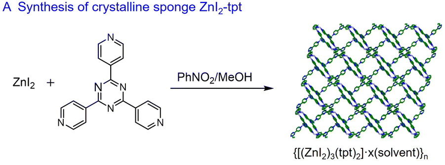 晶体海绵本质是具有均匀纳米孔道的多孔结晶材料,比较常见的是金属有机框架(MOF)材料 ,由金属离子与有机配体配位组装而成,具备孔径均一、结构稳定、比表面积大的特点。TPT-ZnI2、ZIF系列等均可作为晶体海绵用于油状分子的结构确证。此外,部分金属有机笼或超分子组装体在具备规整孔道、结构稳定且能实现单晶到单晶转换时,也可作为晶体海绵使用。[2]
