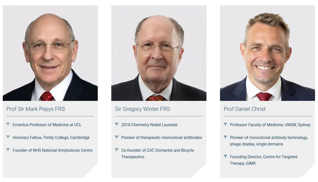 公司由剑桥创新资本和学术创始人Mark Pepys教授、诺贝尔奖获得者Gregory Winter教授以及Daniel