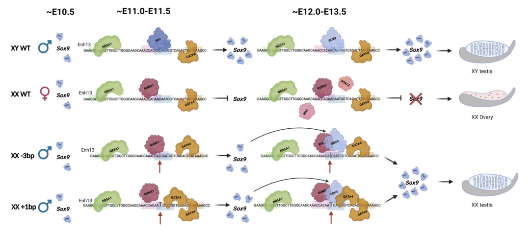 该研究发现,增强子 Enh13 上的单碱基突变就能够超越染色体性别决定机制,促使 XX 染色体小鼠发育为雄性,长出雄性生殖器和睾丸。这项研究表明了 Enh13 既是 SOX9 的增强子也是其沉默子,并首次揭示了决定胚胎发育出卵巢还是睾丸的分子机制。