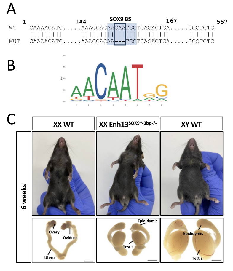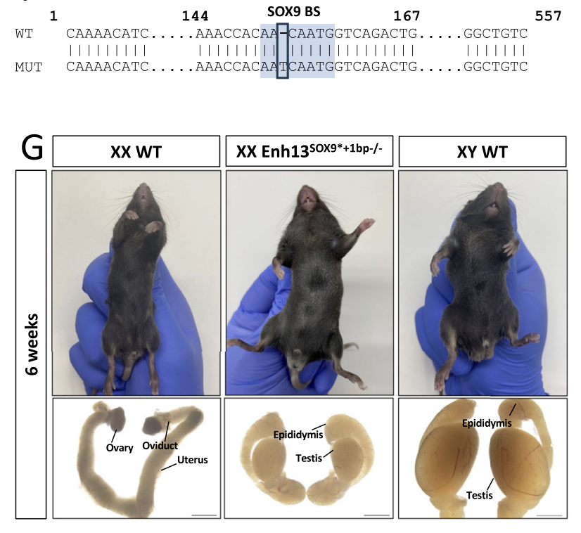 研究团队通过 CRISPR-Cas9 基因编辑技术,在小鼠 Enh13 的 SOX9 结合位点引入了两种微小突变:一种是 3 个碱基对的缺失(-3bp),另一种是单个碱基对的插入(+1b p)。令人惊讶的是,携带这些微小突变的 XX 小鼠竟然表现出完全的性别逆转,长出了雄性生殖器官和睾丸。