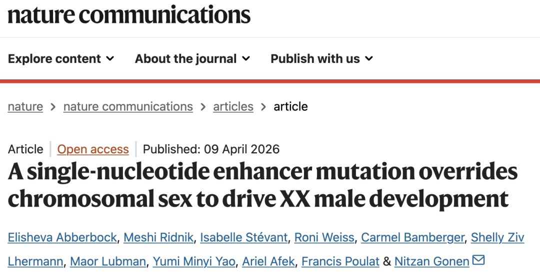 2026 年 4 月 9 日,以色列巴伊兰大学的研究人员在 Nature 子刊 Nature Communications 上发表了题为:A single-nucleotide enhancer mutation overrides chromosomal sex to drive XX male development 的研究论文。