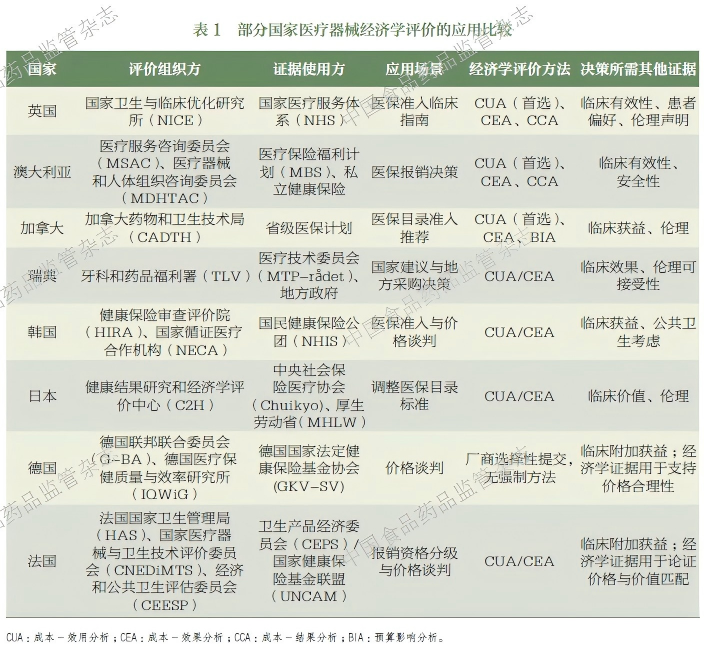 除上述3 种典型模式外,其他部分国家也结合各国国情,形成了具有自身特点的经济学评价应用路径。例如,在法国,实际临床获益和附加临床获益是卫生产品经济委员会(Comité Économiquedes Produits de Santé,CEPS) 定价决策的首要依据[9],而经济学评价仅对年销售额超过2000 万欧元的医疗器械强制要求提交,其结论仅起辅助验证作用,无权调整附加临床获益所确定的基础定价权限[10]。在加拿大,联邦层面对于医疗器械的经济学评价结果仅提供参考建议,医保准入和报销决策最终由各省独立制定,各省在进行地方决策时可自行补充开展经济学评价以辅助决策。在瑞典,通过采用社会视角统计总成本(含生产力损失),在特定情况下对QALY 进行差异化加权,并将人类尊严、需求、团结以及成本效益等原则置于优先地位,以确保医疗资源分配的公平性[11]。在韩国,健康保险审查评价院(Health Insurance Review and Assessment Service,HIRA)对创新医疗器械进行经济学评估,以确定其是否符合国民健康保险(National Health Insurance,NHI)制度的报销资格,并协商确定支付标准[12]。