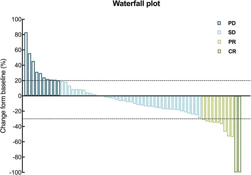 客观缓解率为18.3%(包括2例完全缓解和9例部分缓解),疾病控制率达83.3%。瀑布图显示,多数患者出现了不同程度的肿瘤缩小。