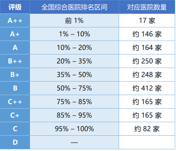 虽然不再设置具体名次,但原有的十档评级体系(A++、A+、A、B++、B+、B、C++、C+、C、D)得以保留,且档位划分更细致,并区分了综合医院与专科医院。