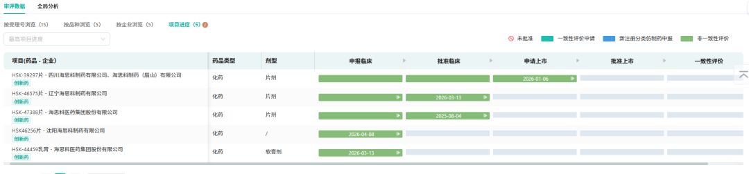 今年以来,海思科的创新药管线推进节奏明显加快。摩熵医药数据显示,2026年至今,海思科已有HSK46256片、HSK44459两款1类新药首次申报临床;此外,HSK-39297片为首次申请上市,而HSK-46575片、HSK-47388片两款1类新药则先后获批临床。这一系列进展显示出海思科正处于从“仿转创”向“创新驱动”跨越的关键窗口期。