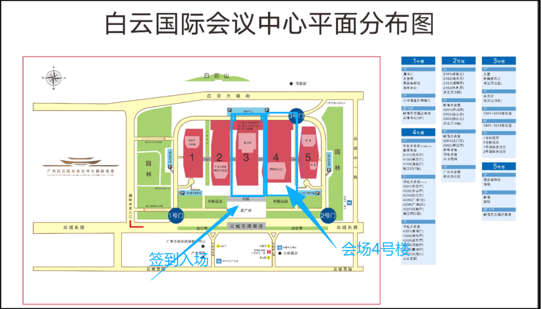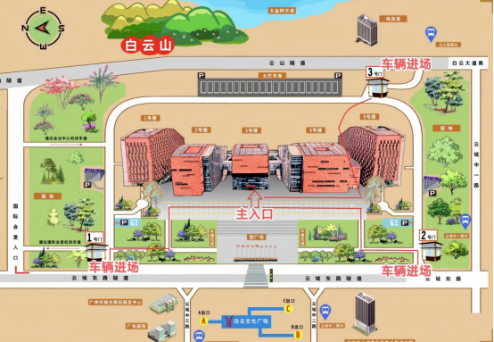 导航至广州白云国际会议中心1号门、2号门、3号门,根据指引驶入停车场,随后步行至广州白云国际会议中心3号楼进入会场。