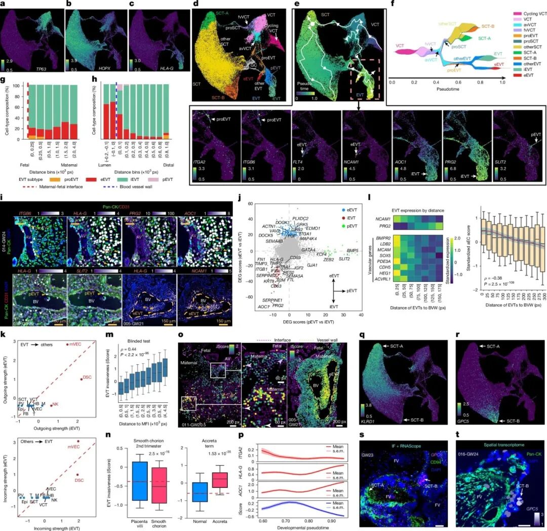 母胎界面是妊娠期间母体子宫蜕膜与胎盘绒毛外滋养细胞(EVT)相互交织形成的动态区域,对成功妊娠至关重要,此前的研究多局限于特定的孕周窗口。本研究则整合了大规模配对单细胞核转录组、染色质可及性谱分析,以及亚微米分辨率(0.5微米)的空间全转录组测序和多重蛋白成像技术,对覆盖整个妊娠期的正常妊娠样本进行了深度解析。