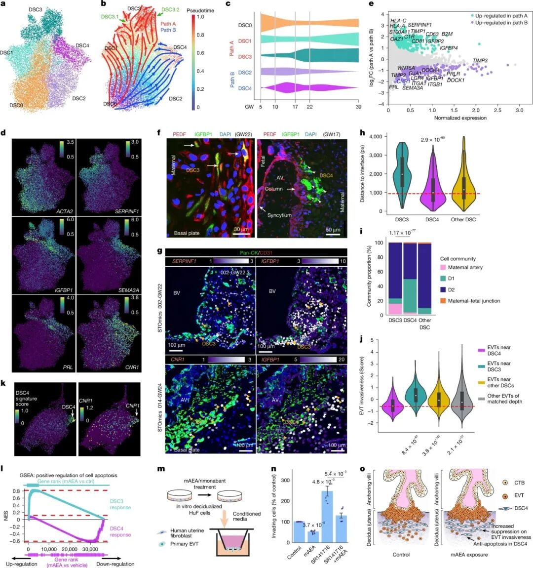 研究最引人注目的发现之一是鉴定出一种全新的蜕膜基质细胞亚型——DSC4。这种细胞特异性地表达大麻素受体CB1,并且主要富集在靠近绒毛附着点的浅层蜕膜中。