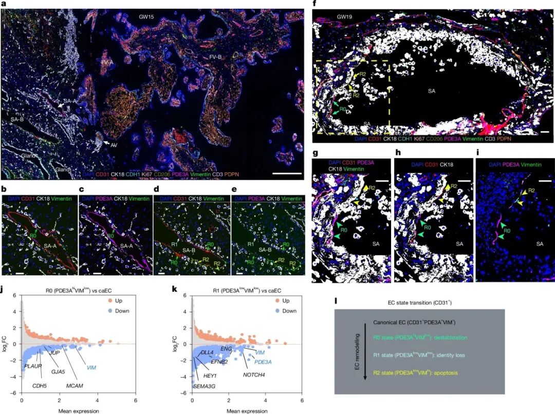 研究团队观察到,当EVT开始重塑血管时,管壁上的典型动脉内皮细胞(caEC)首先进入一个预启动状态(R0),其特征是细胞连接和抗原呈递相关基因的下调。随后,细胞进入R1状态,开始丢失动脉内皮细胞的身份标记。最终,细胞转变为R2状态,高表达促凋亡基因,并从血管壁上完全脱离、走向凋亡,从而被EVT取代。