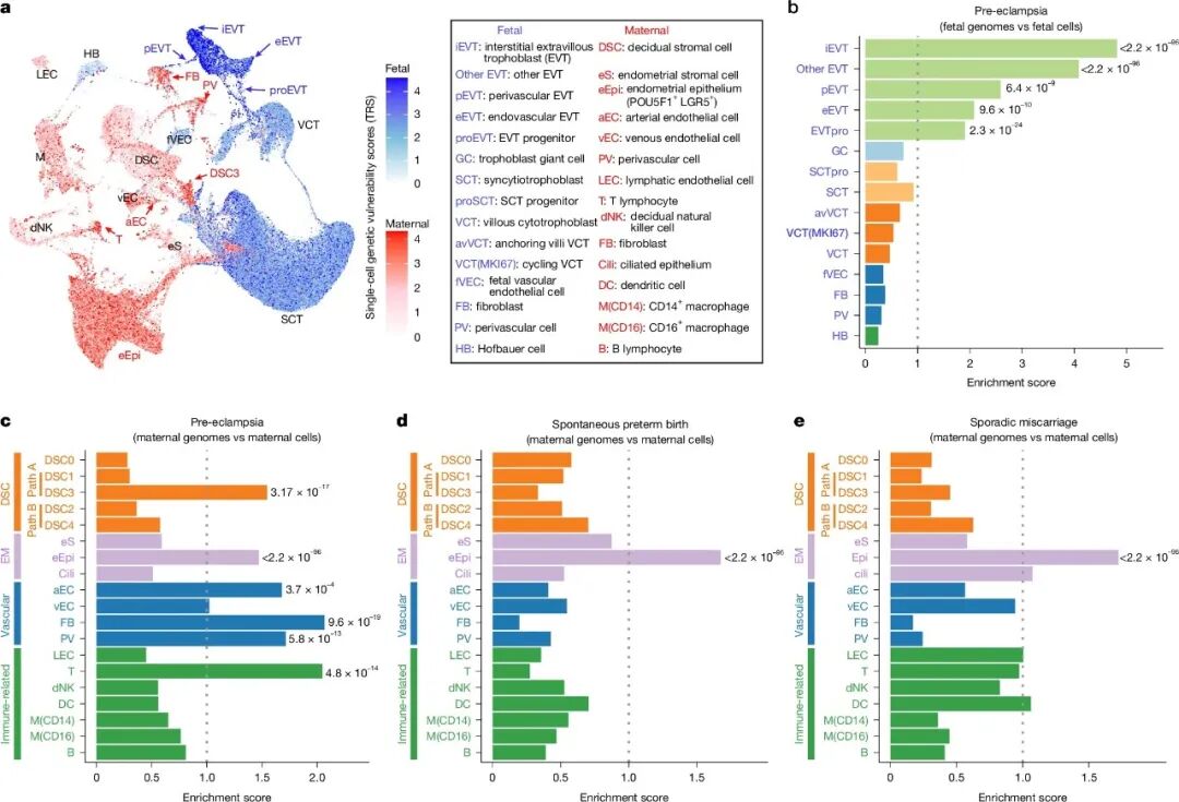 为了探究该图谱的临床价值,研究团队将单细胞染色质开放区域数据与大规模全基因组关联研究(GWAS)数据相结合,绘制了子痫前期、自发性早产和流产的细胞类型特异性遗传风险图谱。