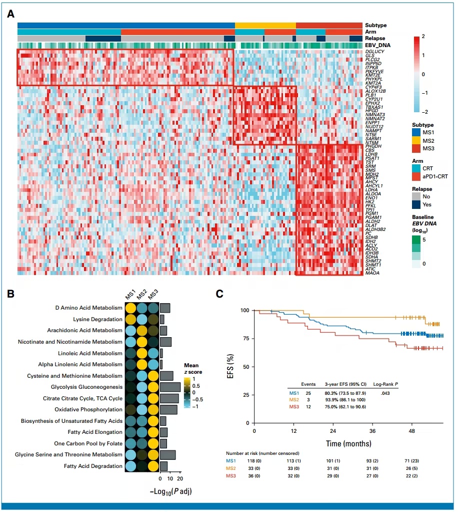 在该研究中,三种代谢亚型被鉴定为具有不同的肿瘤固有和免疫特征,以及在放化疗(CRT)中加入抗PD-1的不同EFS获益。具体来说,与CRT单独治疗组相比,MS1亚型在抗PD-1+CRT治疗组的3年EFS有显著改善,而MS2和MS3亚型没有获得显著的生存益处。亚型特征保留在验证队列中,具有一致的预后和预测价值。