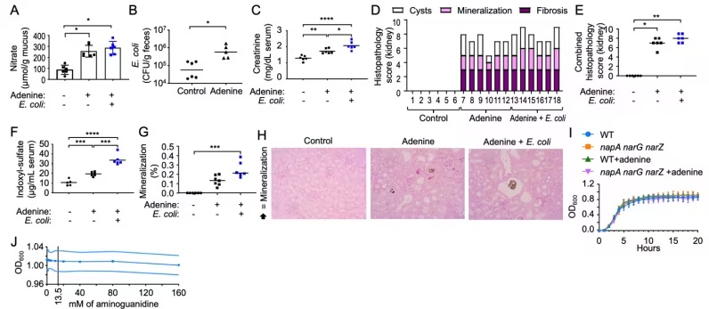研究团队证明,肾功能损伤会增加结肠中的硝酸盐水平。硝酸盐为大肠杆菌(E. coli)产生吲哚提供了助力,吲哚是一种有机化合物,会转化为有害废物——硫酸吲哚酚,从而进一步损害肾脏。阻断肠道中一种单一酶——诱导型一氧化氮合酶(inducible nitric oxide synthase, iNOS)的产生,就能够阻止这一破坏性循环。