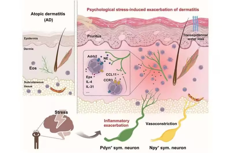 为了确定压力是否是这些发作的原因,研究团队研究了患有湿疹样皮肤的小鼠,并使它们暴露于各种压力情境中。与人类患者一样,小鼠的嗜酸性粒细胞显著增加,皮肤损伤也更严重。