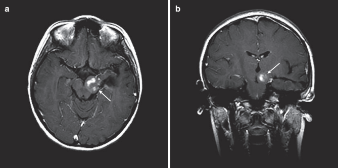 图5:一位儿童脑桥胶质瘤的术后。该病例使用左侧颞中回入路,在颞部开颅手术后切除病灶。神经导航用于识别肿瘤的边界及关键神经组织定位,用穿孔锥来减少病灶体积。(a) 轴位 T1增强 MRI 显示肿瘤的轨迹及占据左侧被盖的肿瘤小残留。(b)冠状位增强 MRI,描绘了从颞中回通向中脑的肿瘤轨迹和小残留。该患者后续进行了化疗,不需要再次手术。没有新的神经功能缺损,但术后2周出现短暂性语言障碍。
