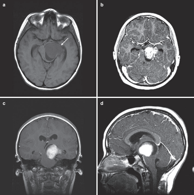 图4:12 岁女孩,进行性右侧肢体无力和共济失调3月。(a) 轴位T1 MRI 显示占位性病变占据脑干左侧被盖区(箭头)。(b)增强后,病灶明显均匀强化。(c) 冠状位T1 MRI增强后显示起源于左侧中脑被盖区的巨大病变,延伸到丘脑。有时,这些病灶被称为“丘脑大脑脚”病变。(d) 矢状位 T1 MRI增强后显示典型的局灶性中脑胶质瘤,中心强化。