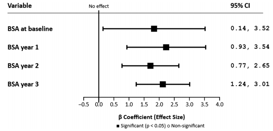 校正年龄、性别、治疗指征、Tanner分期后, 体表面积与 IGF-1 SDS 在 各 治疗时间点均呈显著正相关 :基线β = 1.83(P = 0.034)、治疗1年 β = 2.23(P < 0.001)、治疗2年β = 1.71(P < 0.001)、治疗3年β = 2.12(P < 0.001)。