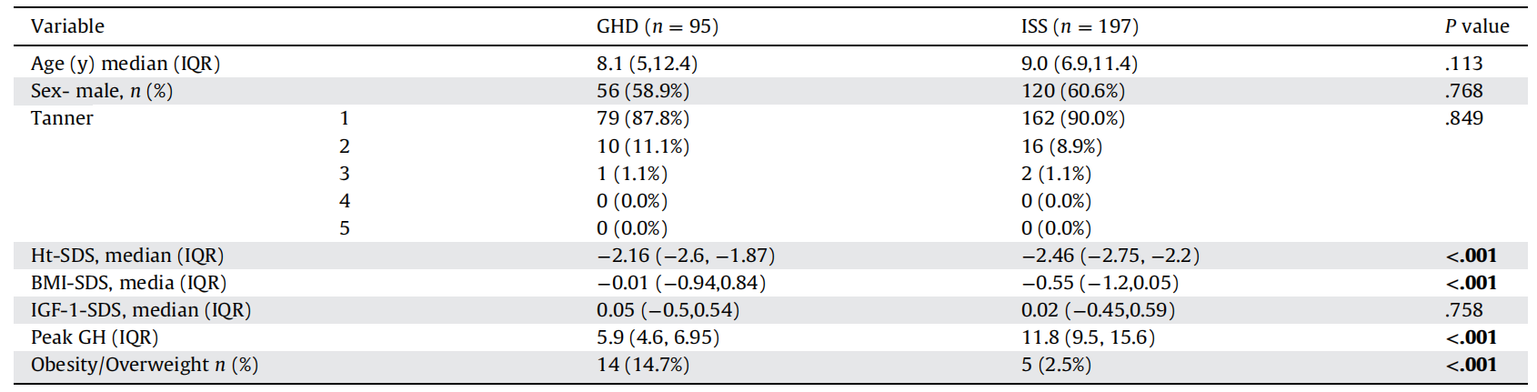 本回顾性研究纳入2016 - 2021年在以色列一家三级儿科转诊中心内分泌科接受GH治疗的矮身材儿童,含生长激素缺乏症(GHD)和特发性矮身材(ISS)。