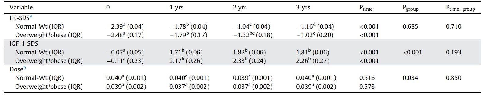注:正常体重组268例,超重 / 肥胖组19例。同一行中具有不同上标(a、b、c、d)的数值间差异显著(P < 0.05)。a校正GH剂量,b校正IGF-1 SDS及疾病类型。