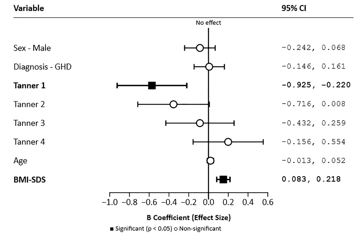 图1 GH治疗期间临床变量与IGF-1 SDS之间的关联性森林图