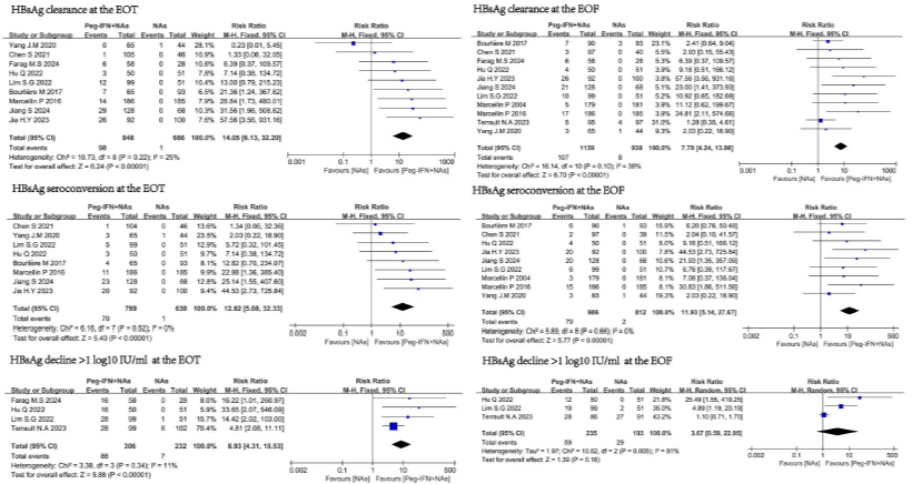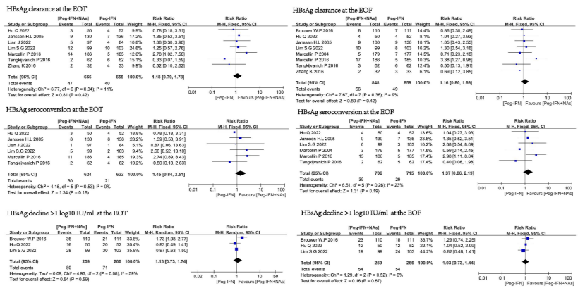 在EOT时,Peg IFNα与NAs联合治疗组的HBsAg清除率显著高于NAs单药组(RR: 14.05),HBsAg血清学转换率也显著提高(RR:12.82)。在EOF时,这一优势依然存在:HBsAg清除率(RR:7.70)和血清学转换率(RR:11.93)均显著优于NAs单药组。