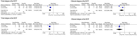 与Peg IFNα单药治疗相比,Peg IFNα联合NAs治疗在EOT时的病毒学复发率(RR:0.14,)和临床复发率(RR:0.27)更低。同样,在EOF时,联合治疗组显示出更低的病毒学复发率(RR:0.08)和临床复发率(RR:0.08)
