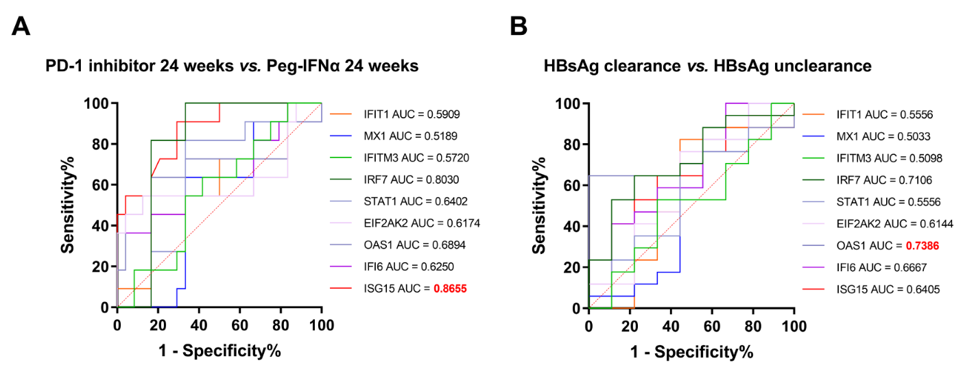 干扰素通路相关细胞因子(ISG)的ROC曲线分析 A.联合治疗组和对照组24周时ISG差异的ROC曲线 B. 联合治疗组中区分HBsAg清除患者与未清除患者的 ISG ROC曲线